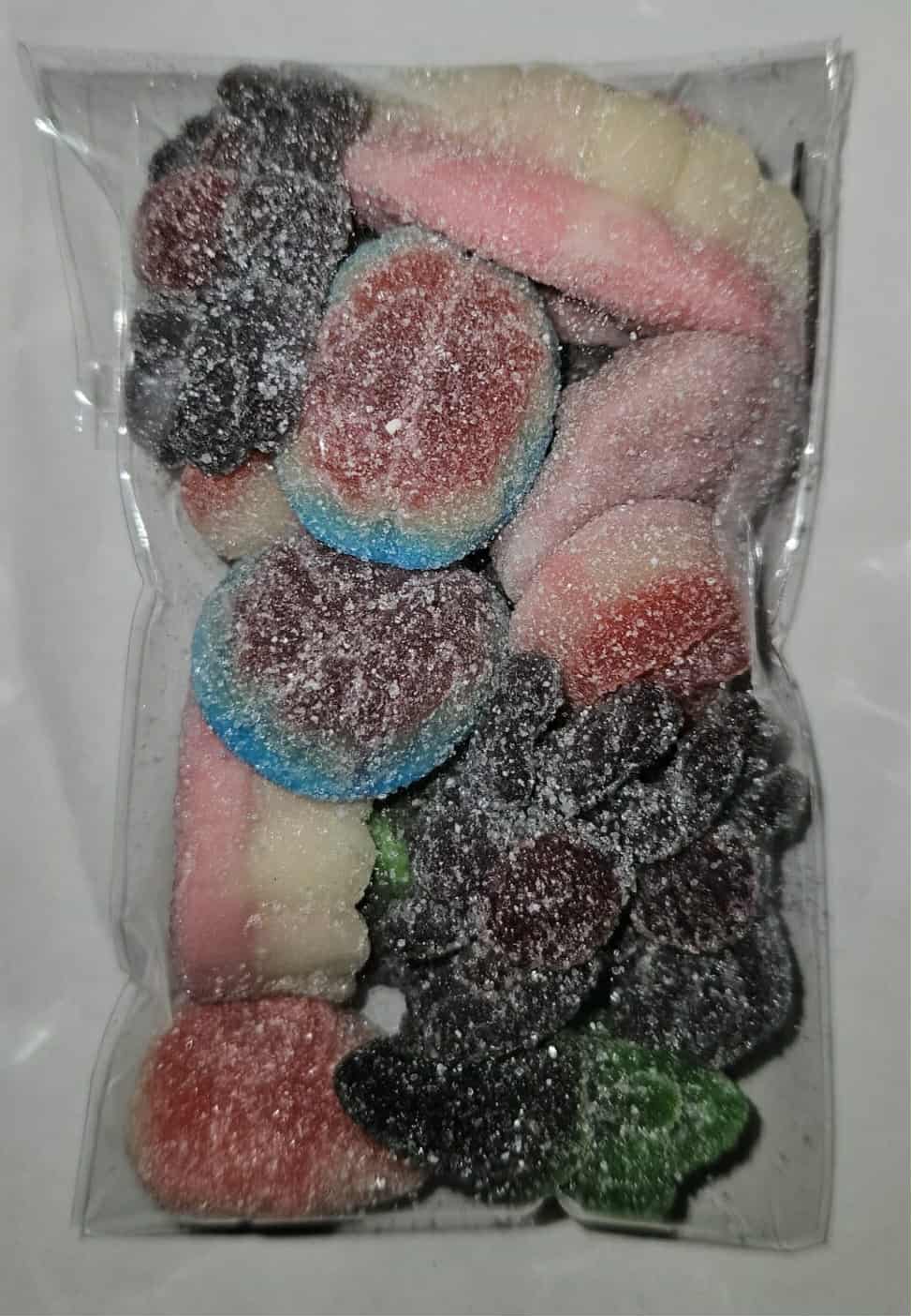 Ingrédients : Sucre, Sirop de glucose-fructose, farine de blé, farine de froment, acidifiant (acidie citrique E330, acide malique E296), dextrose, huile végétale (huile de palme), arôme, colorants (E100, E131), antioxydant : acide ascorbique (E306).